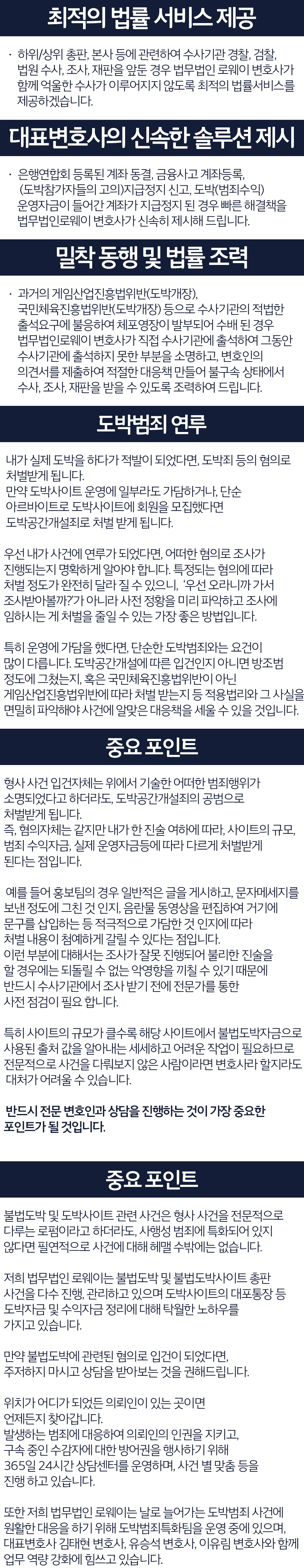 저희 법무법인 로웨이는 불법도박 및 불법도박사이트 총판 사건을 다수 진행, 관리하고 있으며 도박사이트의 대포통장 등 도박자금 및 수익자금 정리에 대해