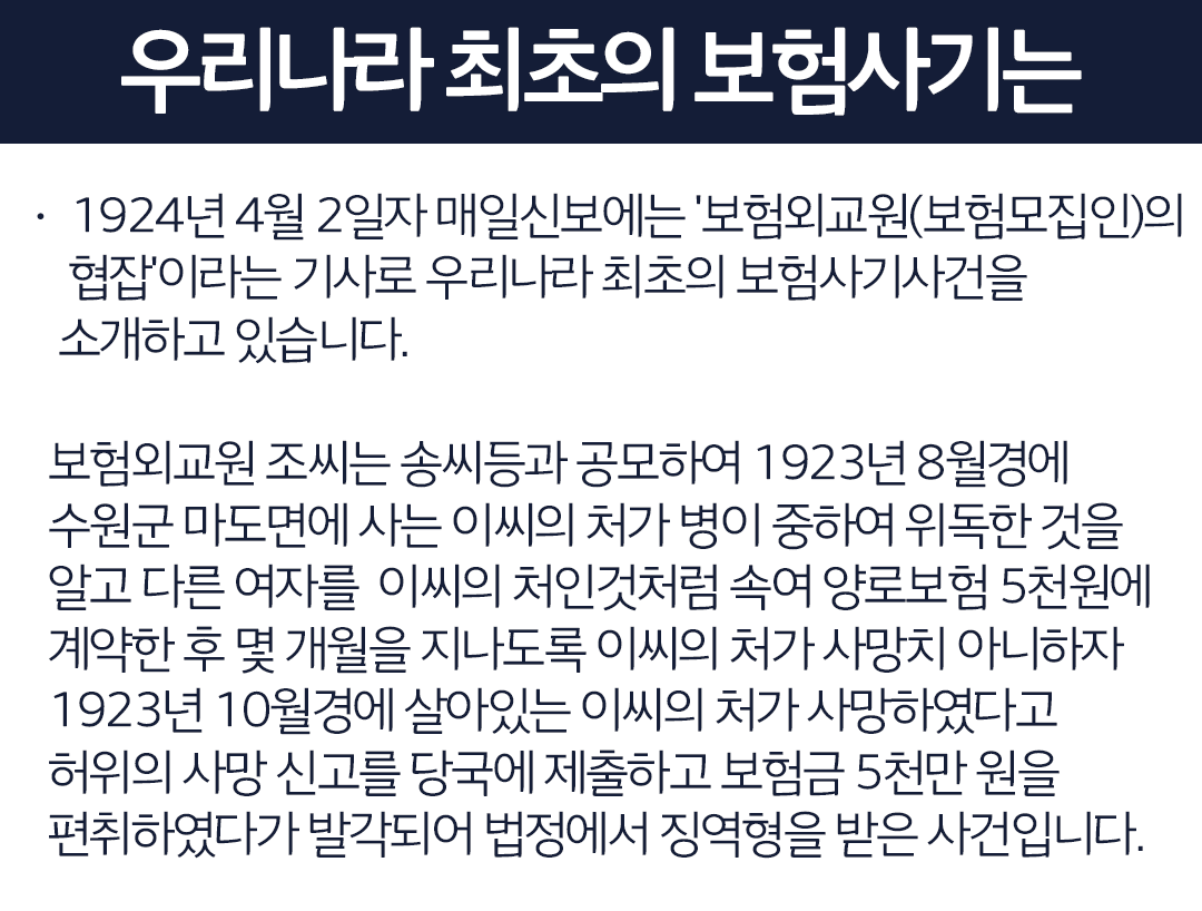 ㆍ 1924년 4월 2일자 매일신보에는 '보험외교원(보험모집인)의 협잡'이라는 기사로 우리나라 최초의 보험사기사건을 소개하고 있습니다.