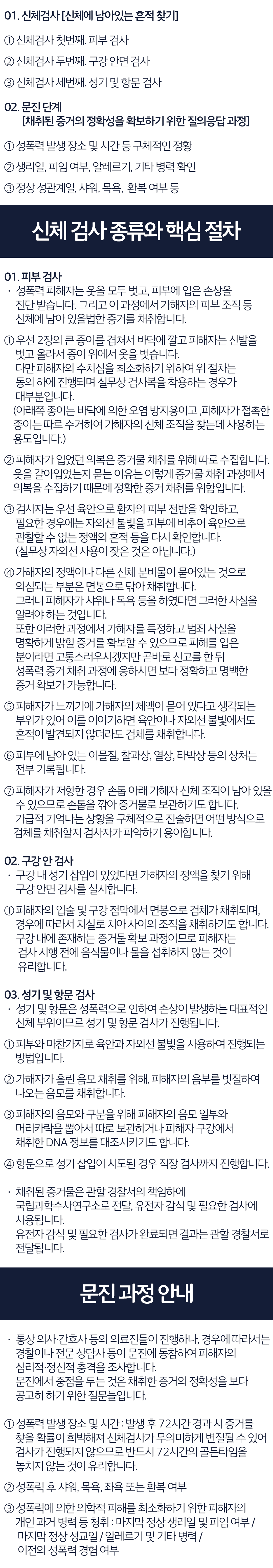 ㆍ 구강 내 성기 삽입이 있었다면 가해자의 정액을 찾기 위해 구강 안면 검사를 실시합니다.